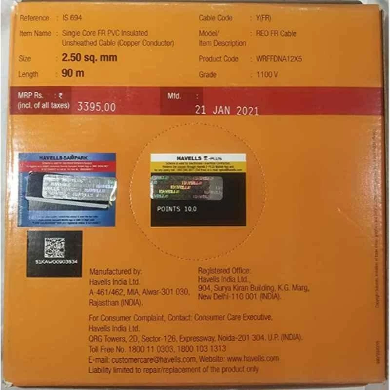 Havells Reo FR PVC 90m 2.5 Sqmm Single Core Green Copper Insulated Cable is a low tension cable that is perfect for a variety of applications. It is made with high quality materials and is designed to be durable and long lasting. Are you in need of a reliable and high-quality low tension cable? If so, then the Havells Reo series is perfect for you! Made with copper conductor material and IS 694 standards, this90 m long cable is sure to meet all your needs. Additionally, it is available in the gorgeously sleek green colour. If you&s;re looking for low tension cables that won&s;t let you down, look no further than our 2.5 Sqmm cable.